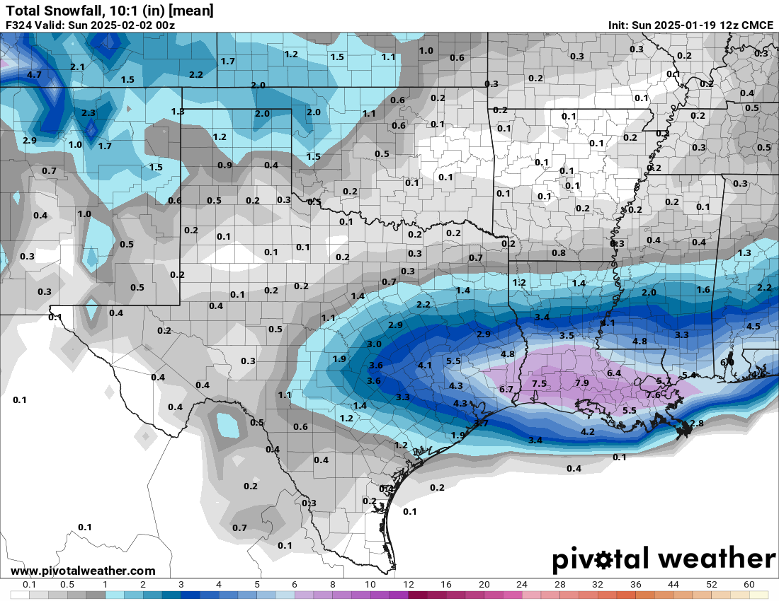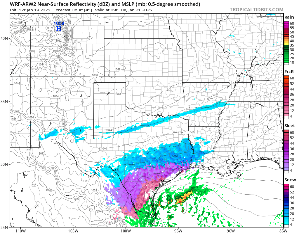 Dense air always wins. We *might* be a little dry up in CLL. NOAA still has us at 80%, though.user:null wrote: ↑Sun Jan 19, 2025 6:59 pmIndeed. But the whole height/thickness field is also trending southward. That is consistent with the NAM suppression trend. So, while the event might be all snow for Houston ... totals are also lowering as well.
