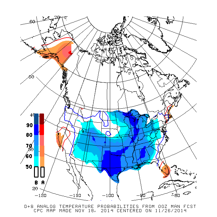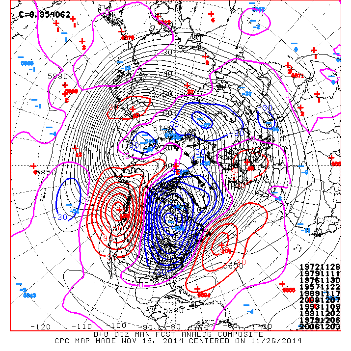 Sustained warming trend will begin on Wednesday after over a week of well below normal temperatures. In fact the gravity of this cold air outbreak can be noted in the record low recorded at Amarillo this morning of 5 degrees and across the nation with nearly 50% of the country with snow cover (33% is average on Christmas Day). The entire state of OK was covered in snow yesterday morning and Dallas recorded a record snow amount of a trace on Monday morning with many locations over N TX having a dusting of snow. Currently November 2014 is running an astounding 8.0 degrees below average for Houston and is currently ranked as the 9th coldest November on record. While a colder and wetter than normal winter is expected across the southern plains, the current cold air outbreak has little bearing on what the rest of winter may exhibit especially with respect to any sustained severe cold air outbreaks and one should be cautious in drawing any conclusions from the recent cold spell and how the rest of winter may play out.