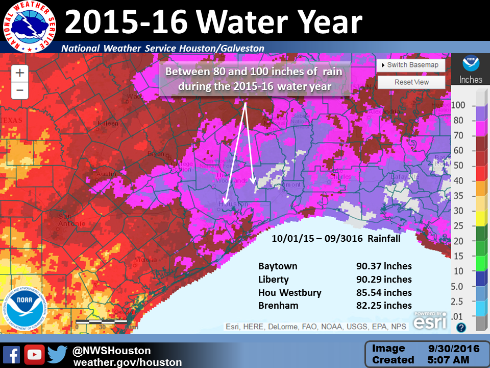 The 2015-16 water year ends today and parts of SE TX received between 80 and 100 inches of rain. Baytown leads the way with 90.37 inches of rain over the last 12 months with Liberty right behind at 90.29 inches of rain. Other notable totals include 77.33 inches at Houston, 69.21 inches at Houston Hobby Airport, 61.48 inches at Galveston and 61.06 inches at College Station.