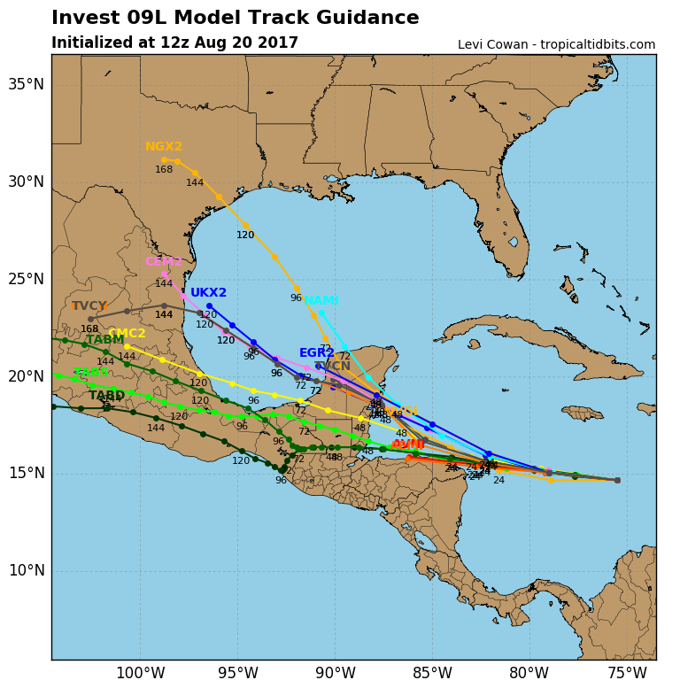 Wave axis continues to move WNW into the western Caribbean Sea, but there has been little to no attempt at the system to try and reorganize. While the wave envelope has expanded to the N over the last 24 hours any weak low level circulation is along the SE flank of the wave and displaced east of the deeper convection. Within the next 24-30 hours the system will be moving inland over the southern Yucatan so the window for any near term development is shrinking. Once in the Gulf of Mexico there is nearly unanimous agreement across the global models that the system will begin to organize and form into a tropical cyclone once again. Track guidance has shifted northward over the last 24 hours due in part to a continued weakness in the ridge that is currently developing over TX and will linger into next weekend. Based on the forecasted steering pattern over the Gulf of Mexico and US Gulf coast by the middle of the week a tropical system in the southern Gulf would likely move NW toward the NE MX/ S TX coast. A stronger system (strong tropical storm or hurricane) would likely turn more NNW and track further northward. Given the current lack of organization and a defined center and the fact that the system will be crossing the Yucatan it is difficult to determine where a new center may form in the Gulf of Mexico and that would have implications on the track.