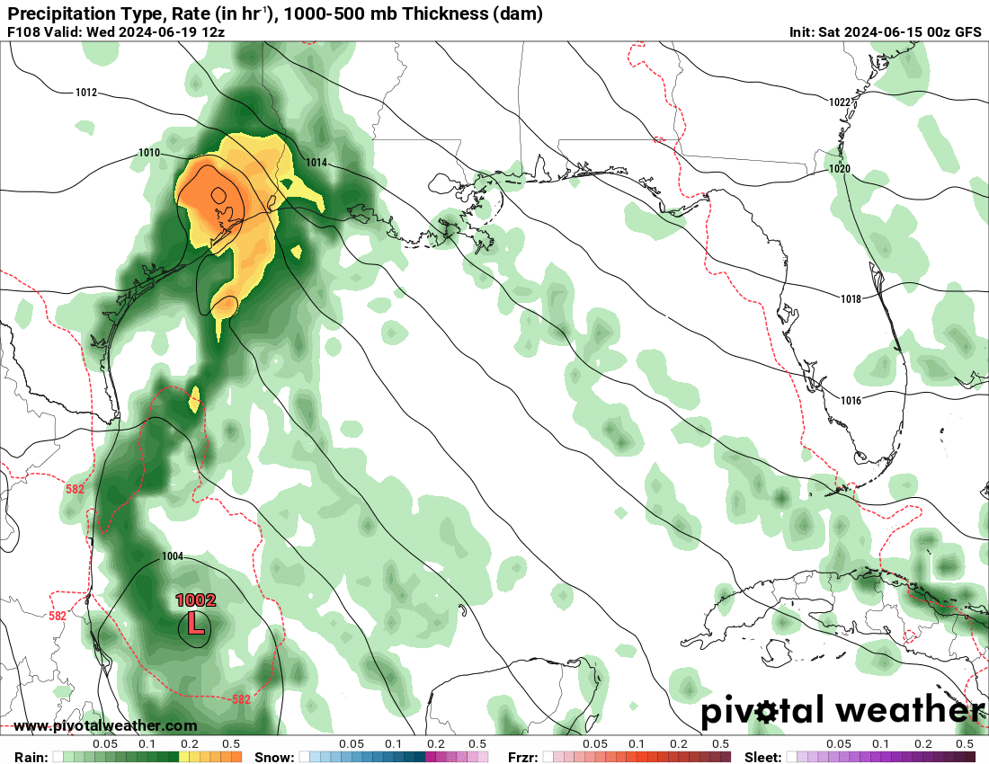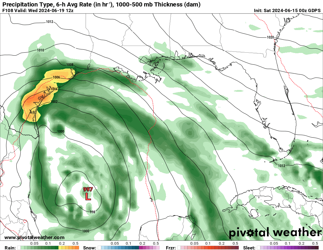 don wrote: Fri Jun 14, 2024 11:09 pm GFS keeps the system weaker in this run, thus allowing the northern piece of vorticity to become more dominate. Producing some very high totals locally.