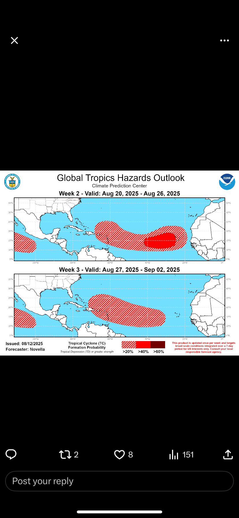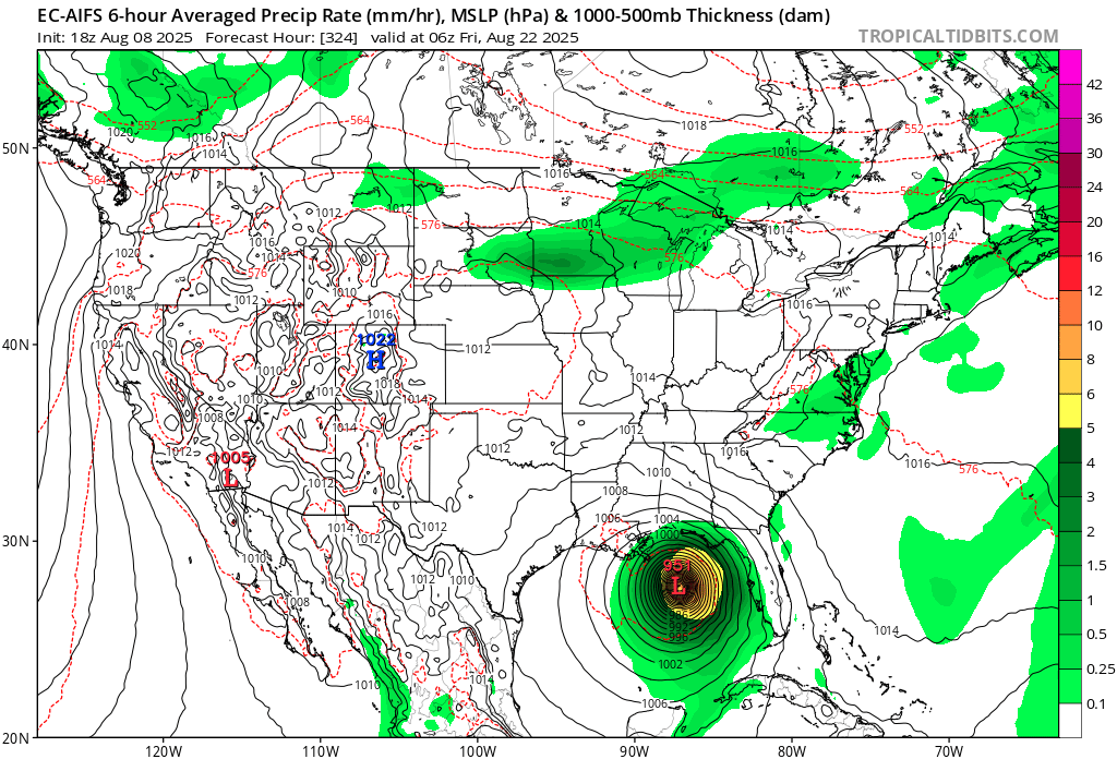This is a nothing burger. Watch the area in the western Caribbean to increase rain chances around here later this week.DoctorMu wrote: ↑Tue Aug 12, 2025 11:26 am X marks the spot on an old boundary in the Gulf. For now, no development is expected and no projected movement - stationed off the Louisiana coast.