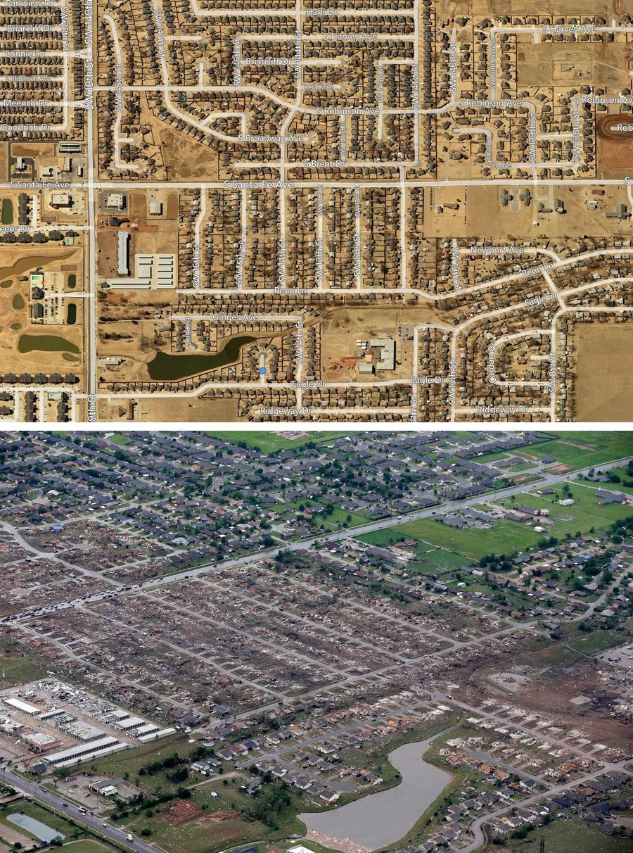 The surprisingly low number of fatalities for such a large tornado is likely attributed to the time of day which the tornado hit and the longer than average lead warning times. The tornado struck in the middle of the afternoon when most residents were at work and not at home unlike the Joplin, MO tornado (Sunday evening at dinner time) and the 5-3-99 Moore Tornado which struck after 600pm. Most of the damage with this tornado occurred in subdivisions and luckily many of the homes were not occupied at the time of the tornado. It is also clear that the two elementary schools impacted offered some of the best shelter/protection even though they suffered extensive damage as noted in the damage photos below of the surrounding subdivision. Children being in those schools and not in the surrounding homes where many likely lived saved their lives.