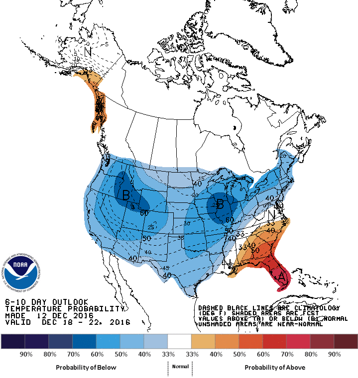 Looking ahead toward the Christmas timeframe via the morning Updated Climate Prediction Center GFS Super Ensembles Day 11+ Analogs, that guidance suggests a big building Ridge across the Northern Pacific indicated by the deeper shades of Red as heights build as well as a strengthen upper Ridge across the SE and Eastern United States that tends to warm up and slow down progression of any colder air from spreading East. Notice the deep Upper trough shaded in Blue that extends from Alaska, Western Canada into the Great Basin. That would tend to favor colder air spilling S versus E and SE as we have seen so far this December.