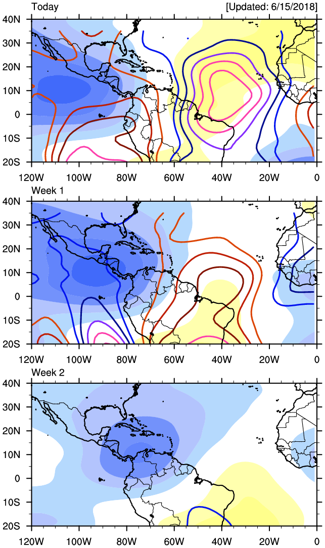 Personally I believe we have a couple of weeks of unsettled weather ahead and that should do some damage to the drought conditions as we head into July. The MJO and a robust CCKW (Convectively Coupled Kelvin Wave) take the lid off the atmosphere allowing for storms to develop almost daily. That second Tropical Wave nearing the Yucatan should arrive mid next week and potentially bring more rainfall chances toward the end of next week.