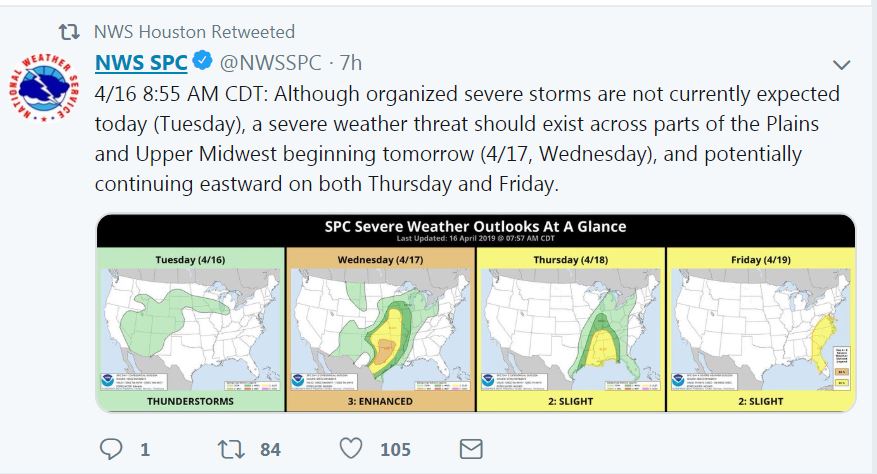 SPC outlook for Wednesday has the highest severe threat probabilities across the Brazos Valley and north of HWY 105 or across areas that were very hard hit on Saturday with tornadoes. Capping will begin to increase after dark on Wednesday evening and it is somewhat in question how far south the line of storms will extend across SE TX. Areas around Matagorda Bay may not see much of a line of storms. With areas north of I-10 and especially N of HWY 105 likely seeing the strongest storms and more solid line of weather.