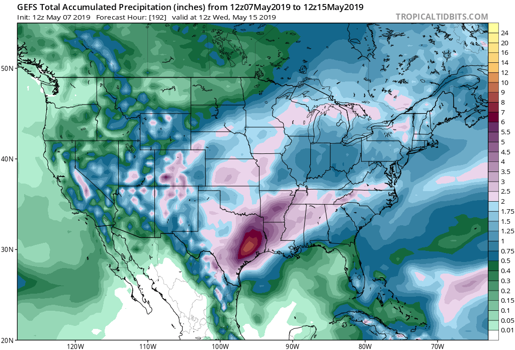 One of the reason we are concerned about the heavy rainfall and flood potential is when the ensembles paint such high totals nearing and exceeding 10 inches, it always raises an eyebrow. This is the latest 12Z precipitation output of the GEFS into early next week.