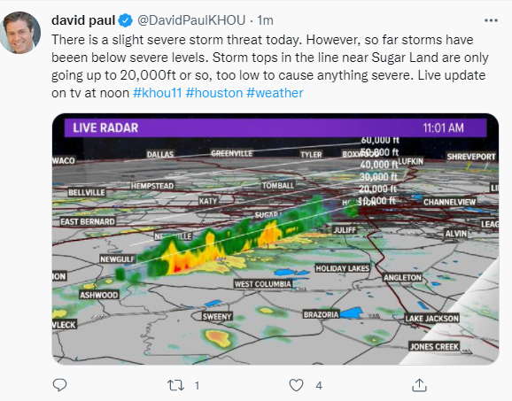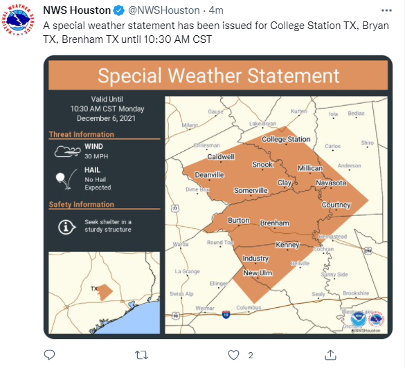 near Cinco Ranch to near Speaks. Movement was southeast at 25 mph.