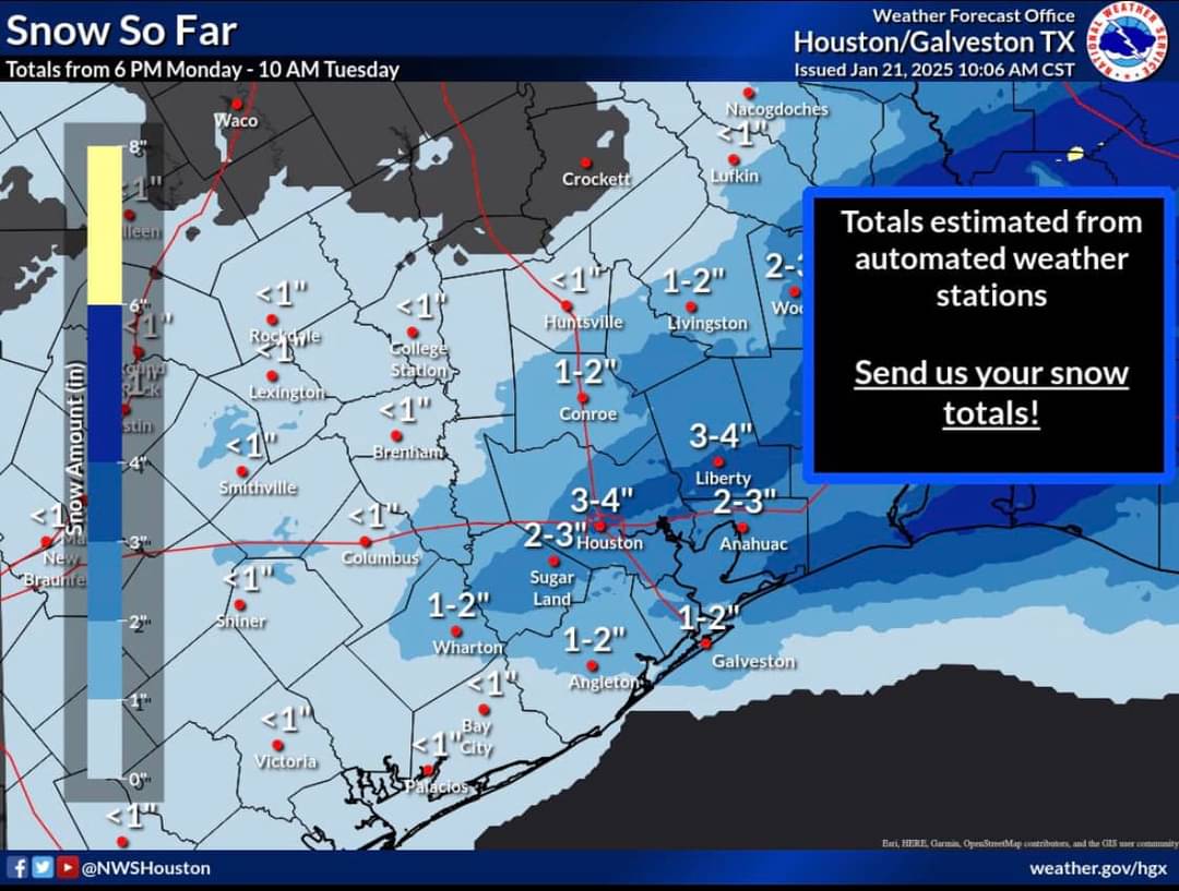 Nearing 2.5”-3” so far in Beaumont. Heaviest should start between now and 10am which we could pick up another 2”-3” on top of whatever has already fallen. Currently in a “Blizzard Warning” for Jefferson county eastward. Not sure how many times that has ever happened if any at all. Blowing snow obstructing view has really picked up over the last hour and overpasses/bridges have been shutdown. This will continue strong till around noon before conditions begin improving.