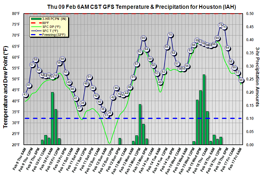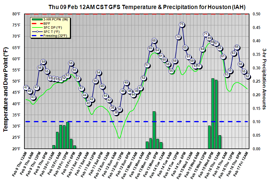 Meanwhile, DST is only 4 weeks away from this Sunday morning, meaning an extra hour of afternoon sunshine that should warm things up nicely and provide for some evening rides after work. I look forward to the day when I see an IAH meteogram and high temps are above the red dashed line! Sunday looks too cold to bike.