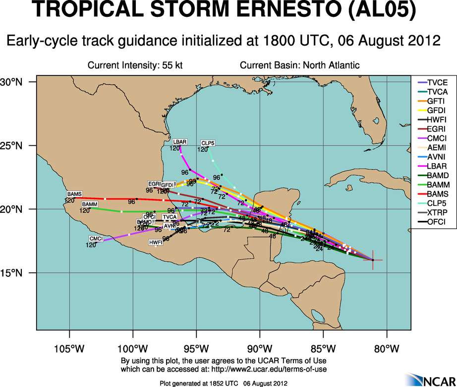 EDIT TO ADD: Also, if you notice, since the NAM model came out this morning, Ernesto has been somewhat following its path than the others - it is moving WNW to NW at the moment...