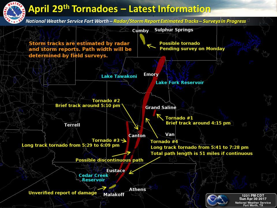 Looks like the survey teams from NWS Ft Worth/Dallas will continue surveying tomorrow. The early indications are the Canton Tornado may have been on the ground for 50+ miles.