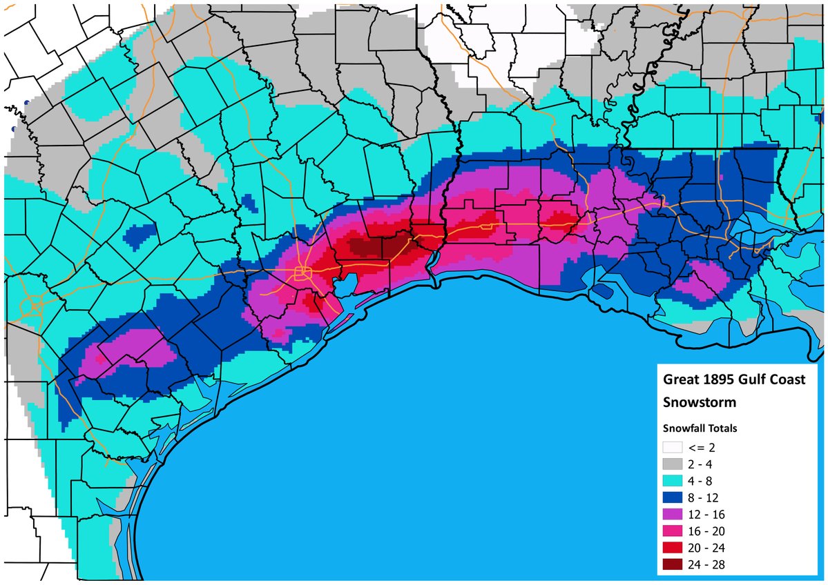Mild Valentine's Day in #Houston today, but 123 years ago, we were dealing with 20" of snow, as was much of SE Texas and SW Louisiana. The story in four parts @SpaceCityWX: https://spacecityweather.com/houston-sn ... galveston/ … #houwx #txwx #lawx