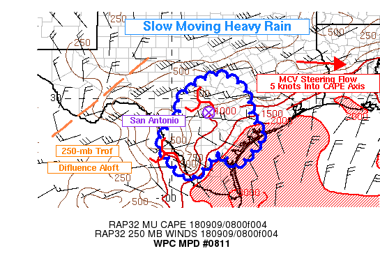 on the weak synoptic mid level flow. An upstream 250-mb trough