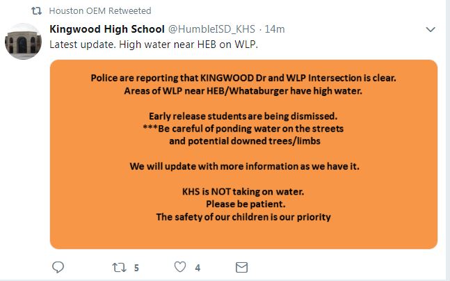 Kingwood High School Tweet About Flooding
