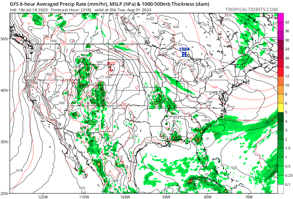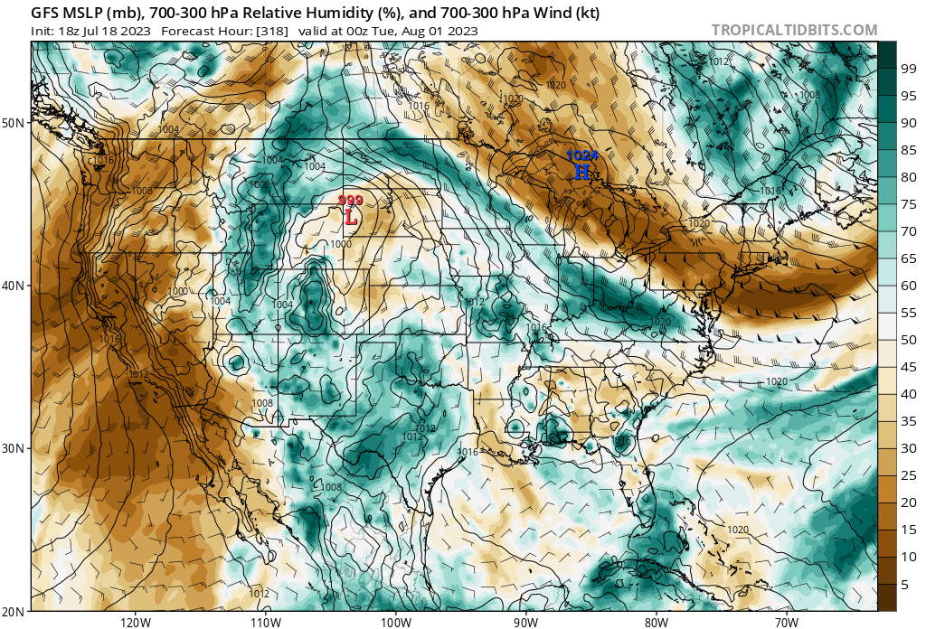 ⬇⬇⬇ See what I mean? And this 18z shows rather favorable patterns too.user:null wrote: ↑Tue Jul 18, 2023 1:49 pm It's also possible that there is a bias of sorts that prevents depiction/manifestation of rain in Texas during summer. Or maybe some other sort of thing mucking stuff up. Look at the 12ZGFS run: plenty of high 300-700mb moisture periods in Texas that yielded paltry amounts at best.