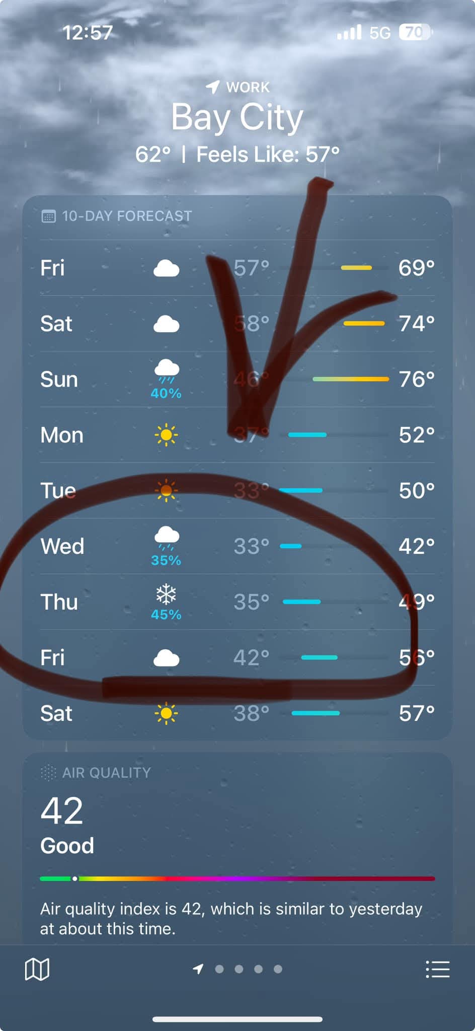 I showed her my screenshots of the weather app 6 days before 2021 storm, 4 days and 2 days. Then I showed her the actual temps.