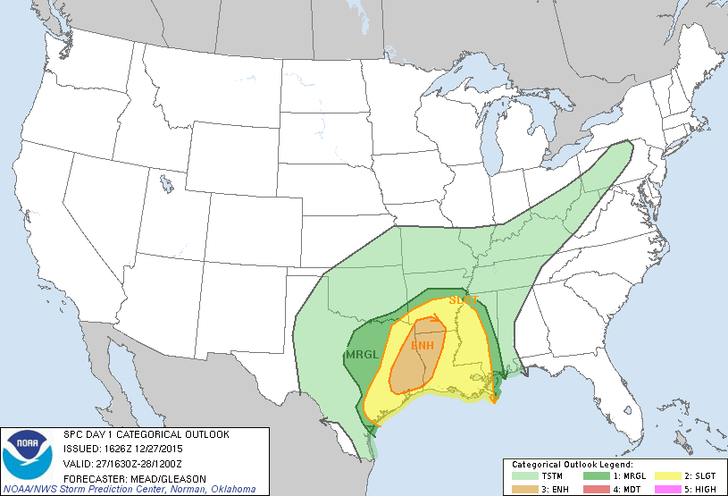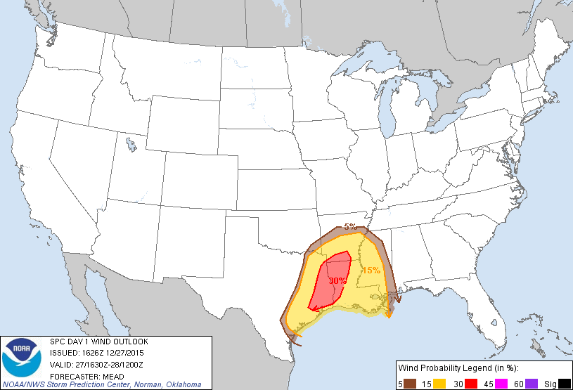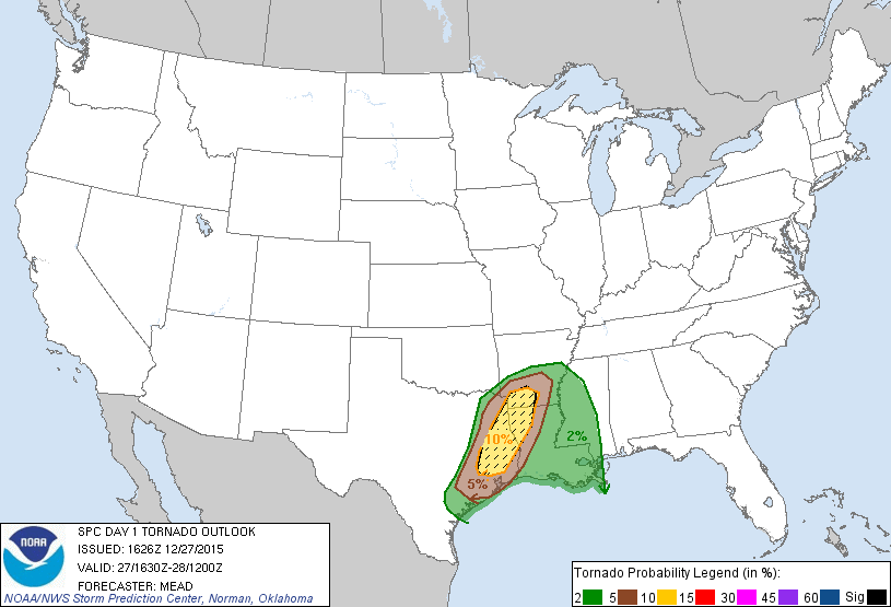 Potential is there for a couple of strong long track tornadoes especially in the 10% probability area for (EF2-EF5) tornadoes along and north of I-10. Cloud bases are low and moisture levels extremely high which may completely obscure tornadoes. Storms will be tracking from the south to north or SSW to NNE very quickly. Act immediately if a tornado warning is issued for your location.