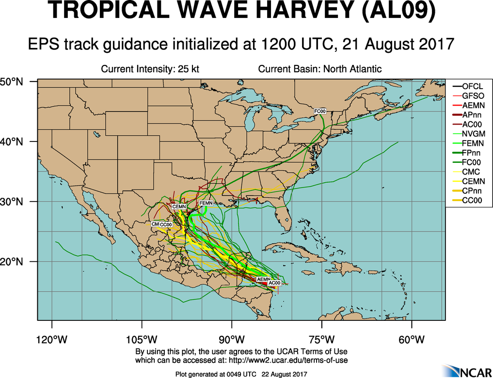 Expect the tropical wave axis to reach the eastern coast of the Yucatan on Tuesday and then emerge into the southern Gulf of Mexico early Wednesday. The well defined upper level low pressure system over the central Gulf of Mexico continues to move westward and will reach the NW Gulf late Tuesday into Wednesday and begin to weaken into a large weakness or shear axis. In other words this feature will break down the remaining ridging over TX and the NW Gulf allowing a trough across the central US by late week to push a frontal boundary deep into the state. This weakness in the ridge appears enough now to turn “Harvey” NW over the Gulf of Mexico with landfall potential from near Tampico, MX to Matagorda Bay, TX. The GFS has become the northern outlier today with a track toward Port Aransas while the CMC is the southern outlier with a track toward Tampico, MX and the ECMWF showing a landfall between BRO and CRP. At this point it is not overly important to focus on individual operational model runs, but instead the trends and the model ensembles. The trends today have been a general more northward track from an early morning consensus in NE MX to a late afternoon consensus over S TX. The CMC, GFS, and ECWMF ensembles are generally aimed at NE MX/S TX.