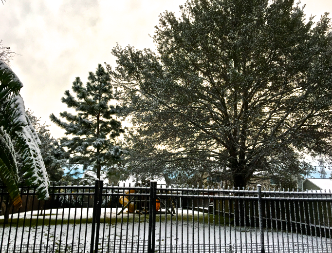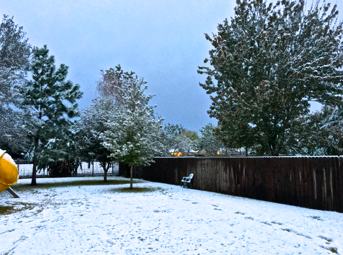 Anyway, here's what we saw this morning looking out a side window. Those are our orange and grapefruit trees covered in snow: