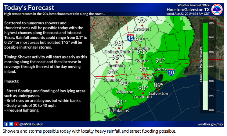 Radar this morning shows numerous showers and thunderstorms over the Gulf waters moving inland across our coastal tier counties. Air mass is very tropical with PWS of 2.1.2-2 inches over the region and GOES sounder showing 2.3-2.5 inches over the Gulf waters. As surface temperatures warm into the mid 80’s expect to see a rapid increase in showers and thunderstorms across much of SE TX. While storm motions will be quick, this air mass will be capable of 1-2 inches of rainfall in less than an hour…maybe even less than 30 minutes which could lead to street flooding. Will need to keep rain chances going tonight along the coast and possibly up to US 59 as moisture continues to stream inland off the Gulf.