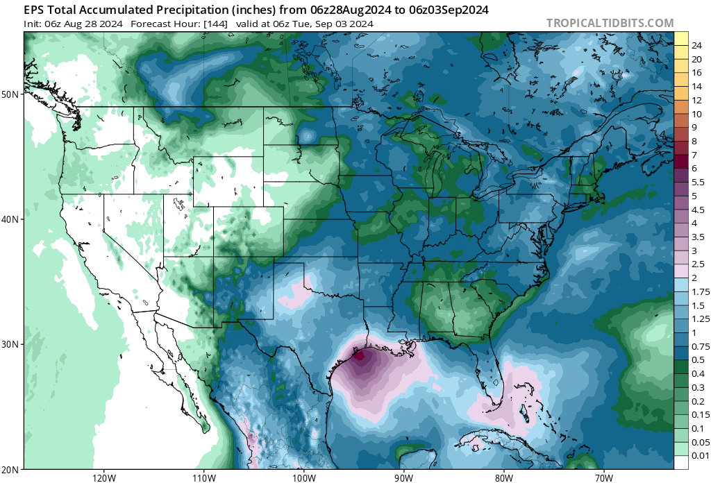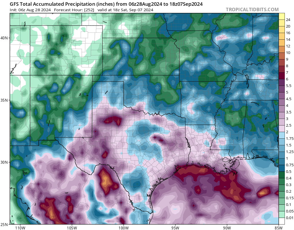Stratton20 wrote: Wed Aug 28, 2024 9:36 am Se texas should get some very healthy rains, heaviest at the coast, but this is a good general thinking, 1-3 inches north of i-10, 4-7 inches across the houston metro and points south, 8-10+ at the coast