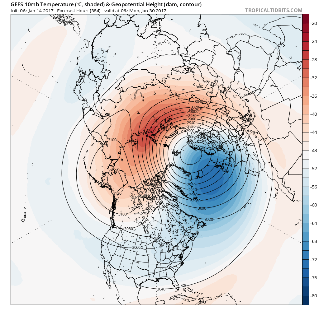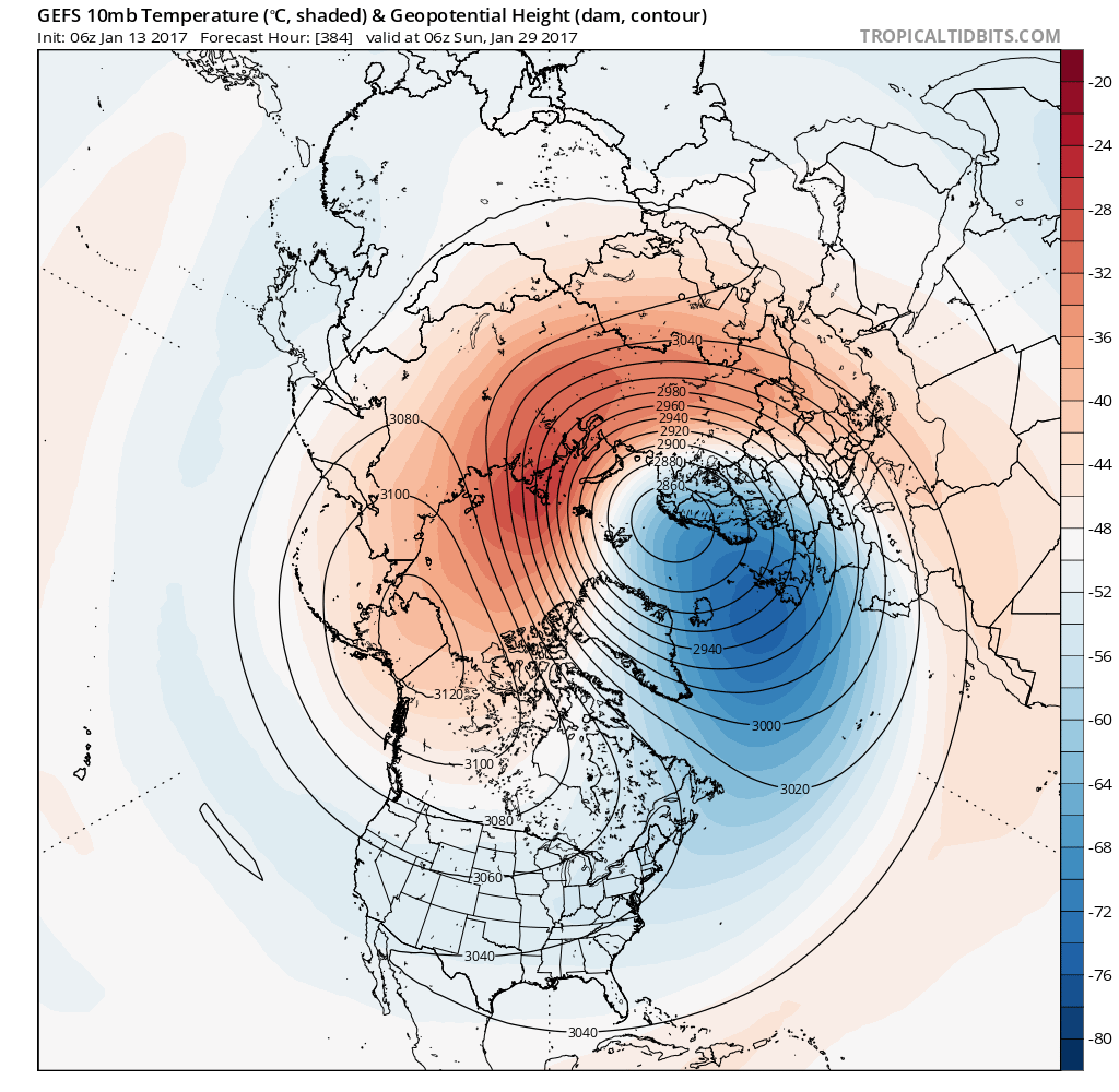 The Longer range MJO forecast via the ECMWF and GFS schemes suggest a wet and stormy pattern begins beyond January 20th. There are also indications that the Stratospheric Polar Vortex may shift more to Europe and begin to split possibly leading to a potential Sudden Stratospheric Warning or Major Mid Winter Warming event where high level winds reverse and often lend to much colder air at the surface where we live. While it is too soon to know exactly what our sensible weather may bring, the indicators we look to are tending to a Major Hemispheric Pattern Change as the end of January nears and we begin February. We will see... ;)