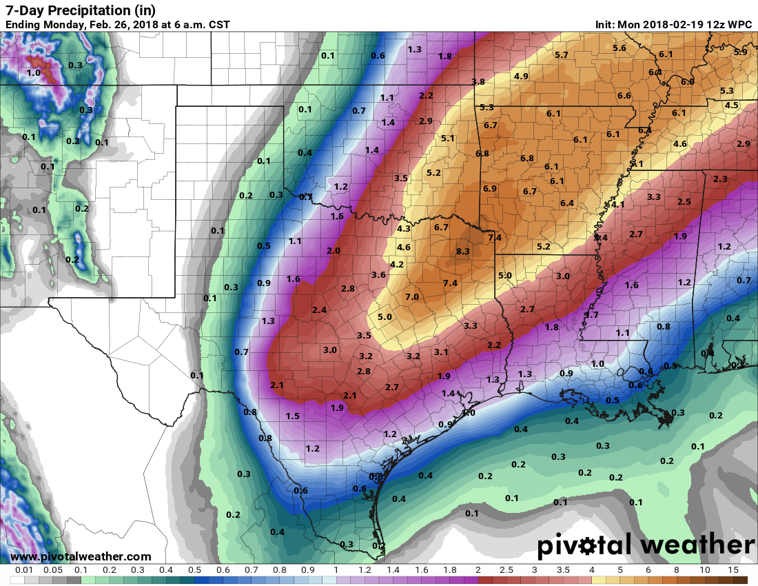 Still looking like a good portion of Central/East and NE Texas will see heavy rainfall over the next week. Below are the GFS totals over the next 7 days. I am seeing some trends in the shorter term mesoscale models that there is some question exactly where that frontal boundary may stall Wednesday. Some suggest across a College Station to Lake Livingston line while others indicate the front may push a bit further S toward Metro Houston. We will need to closely monitor trends today and tomorrow. If that front pushes just a bit further S than currently expected, rainfall amount in the Metro Houston may need to be increased. Currently most of SE Texas is in a Marginal Risk for Excessive Rainfall expect for our Coastal tier of Counties.