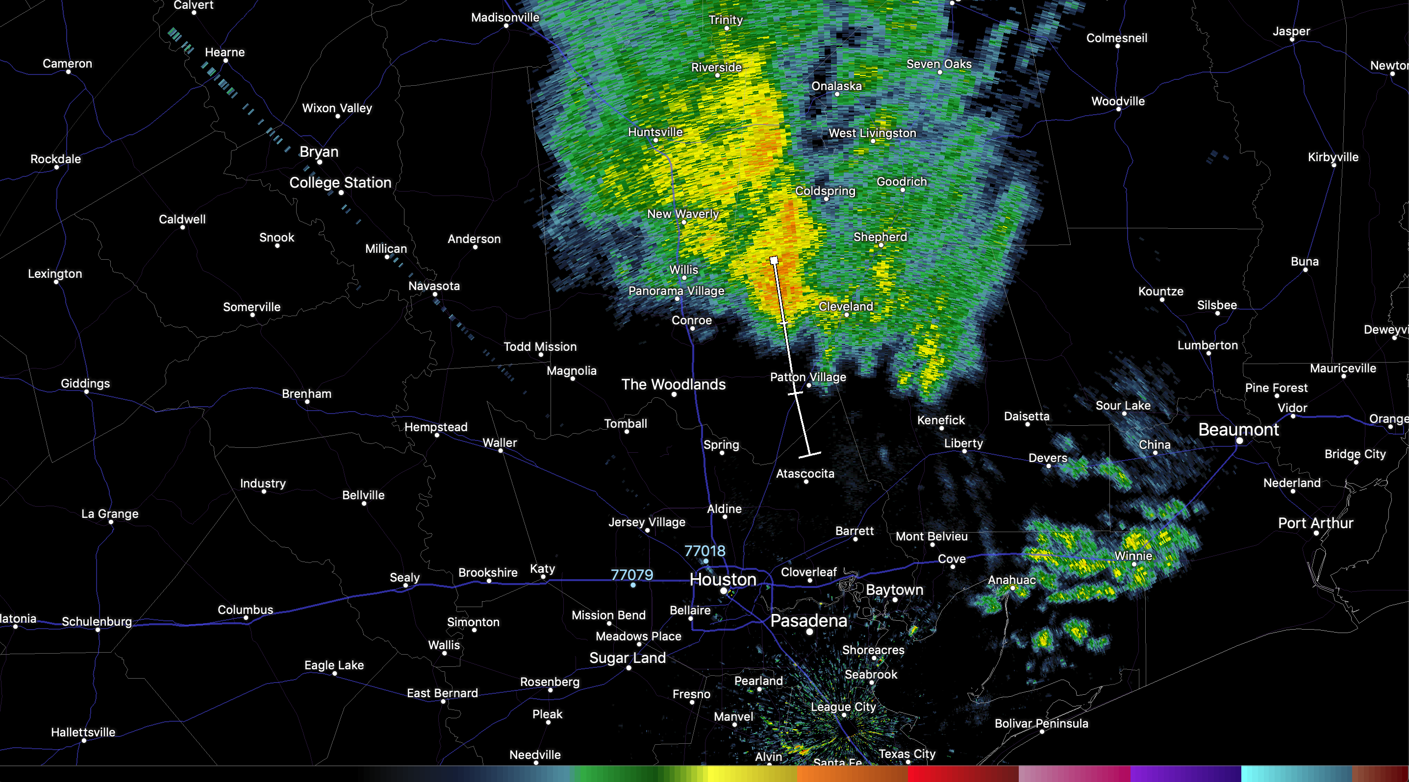 Some examples of bright banding northeast of Conroe currently as the dry snow starts to melt around 2-3kft in the air. That is where your hydrometeor classification is showing more of wet snow/graupel and more returns are reflecting back towards the radar. Not exactly a textbook example but still cool to see.