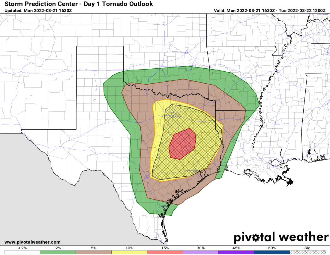 Welp. That escalated quickly!don wrote: ↑Mon Mar 21, 2022 12:31 pm No surprise there.Mesoscale models have been very consistent on supercells developing along the I-35 corridor and moving east later today.With a secondary wave of development refiring in southeast Texas as a jet streak moves in mainly after 9 pm tonight.The secondary wave of storms will consist of a quasi linear MCS.With embedded supercells which look to be be semi discreet.