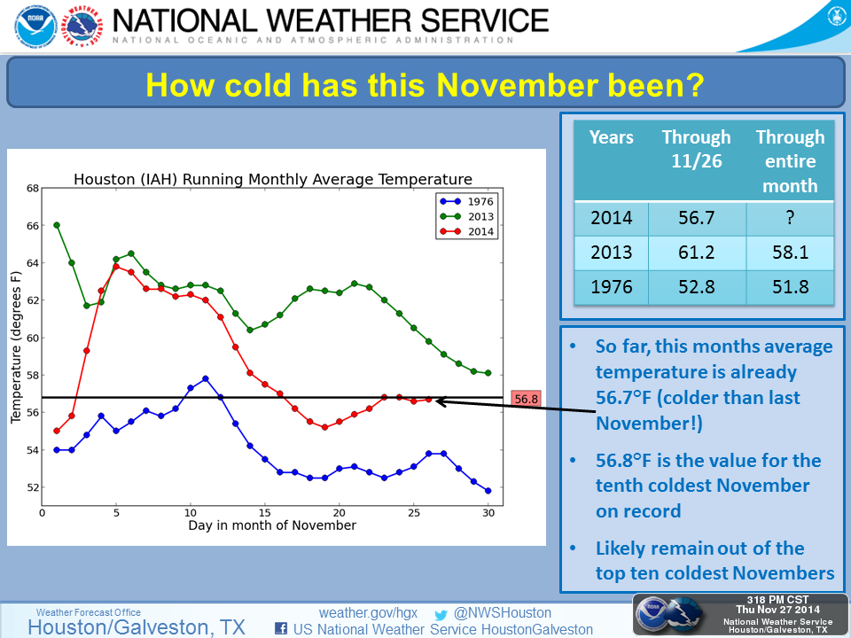 Here is the November Monthly Seasonal Climatology Report for SE Texas issued this morning. If you believed that November was 'colder' than normal, you are correct!