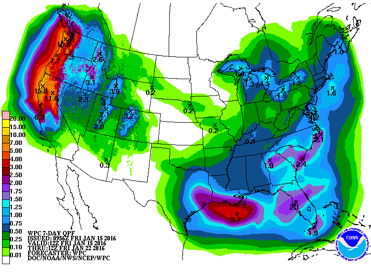 A fast progressive flow continues across the Lower 48 with Pacific Storms lined up set to impact Northern California through the coming week. The Sierra's and the Cascades are benefiting with the current pattern with some locations nearing 250% of there annual snowfall. That is very beneficial for those drought parched Regions out West. Our Texas Drought has been totally wiped out, which is a good thing considering where we were just a short year ago. This strong El Nino has certainly benefited many areas that sorely needed persistent moisture to replenish the snowpack and our local Region's area lakes.