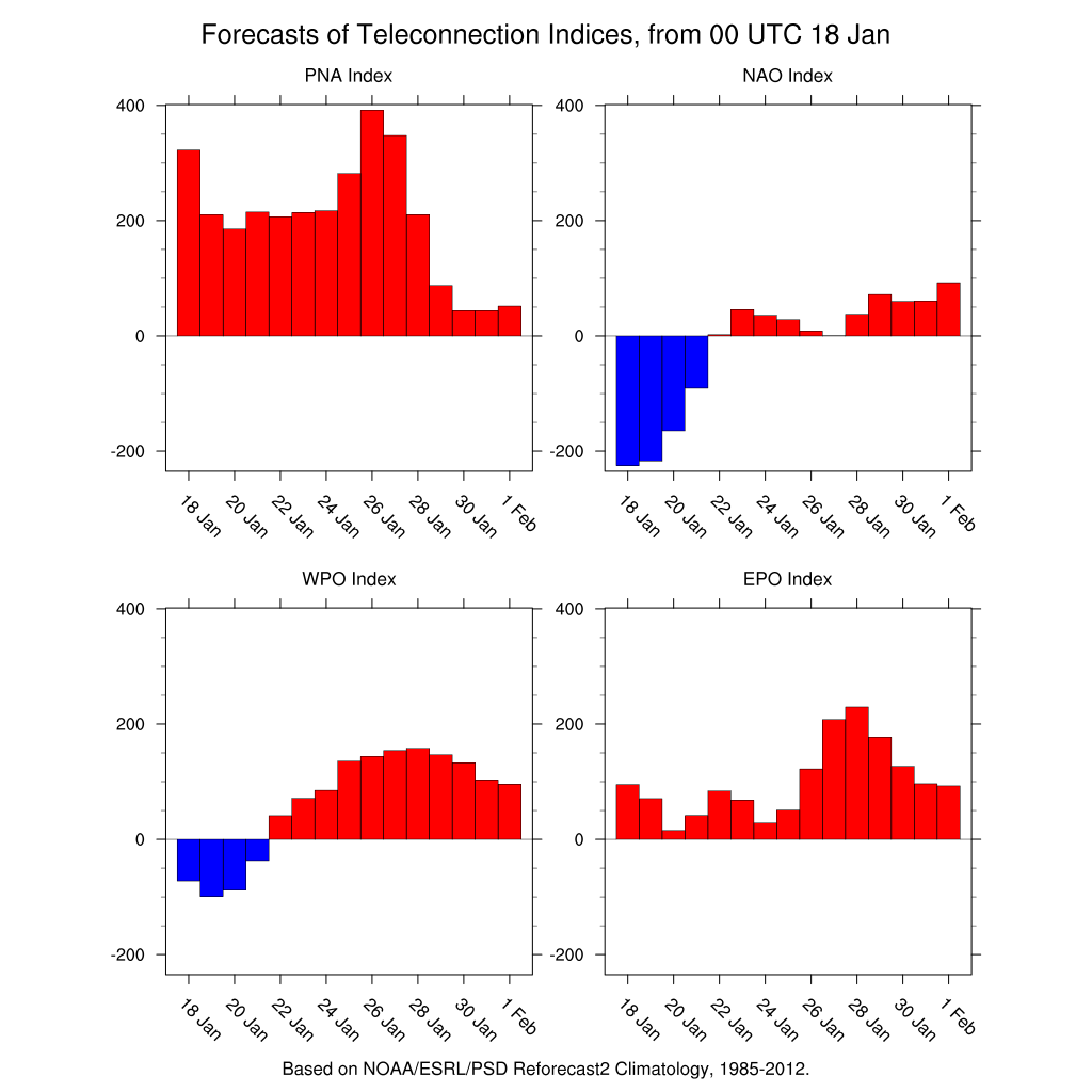 The current Teleconnection Indices and the MJO suggest the tropical convection has shifted back to the Indian Ocean. The morning Updated GEFS Super Ensemble Day 11+ Analogs do suggest the chance of Western Gulf lows developing with the best chance of precipitation along the West Coast, Gulf Coast, Florida and the South Eastern United States. The overnight Operation and Ensemble Guidance are 'sniffing' the potential of a rather potent Storm System during the late January timeframe. Chilly and unsettled weather looks to build across the Western half of the Lower 48 during the late January timeframe with Ridging and a warming trend areas across the Plains and the East Coast. Some of the longer range ensemble guidance does suggest that changes may be lurking across Western Canada as we end January and begin February. Those ensembles are indicating that below normal temperatures will finally develop across our source Regions of Eastern Alaska and Western Canada. IF the longer range ensembles are correct, such a pattern may coincide with our climatologically favored wintry weather peak season of early/mid February. We will see.