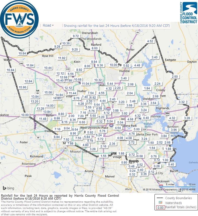 Rainfall amounts of 8-12 inches have occurred across much of northwest Harris County with amounts of 12-15 inches over the extreme NW part of the county into Waller County. Much of the rest NW of the extreme SE part has received 4-6 inches.