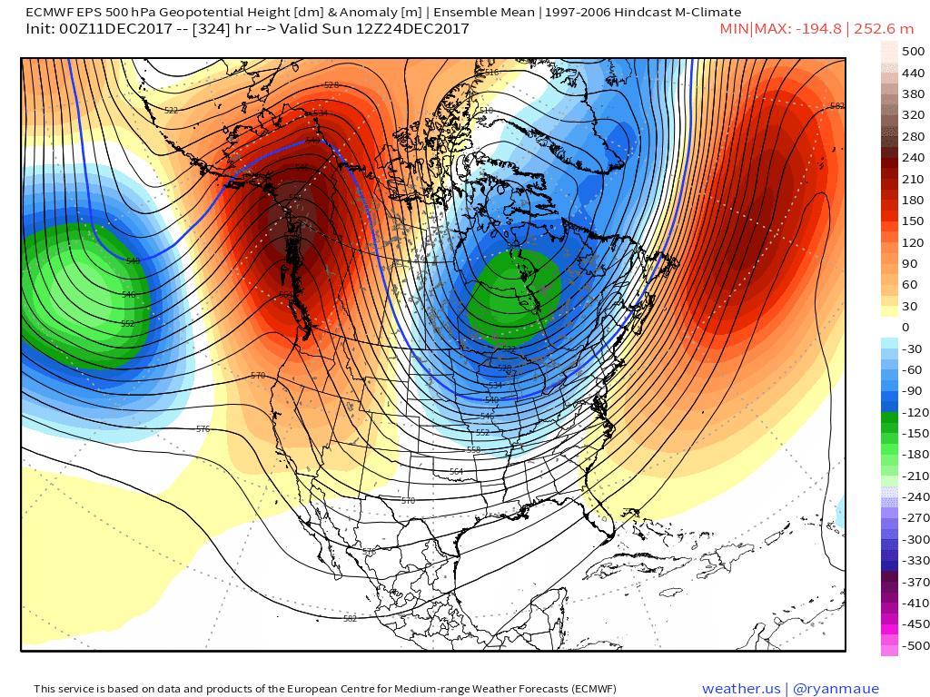 The GEFS/ECMWF EPS Ensembles are fairly consistent with a highly amplified pattern as Christmas arrives. While it is far too soon to know the "finer details" at this range of 2 weeks out, the indicators we look to in the longer range do raise an eyebrow. Christmas Week could be very chilly across much of the Lower 48 should this type of pattern verify. Those heights shown even in the Ensemble 2 weeks out suggest the strongest and likely coldest High Pressure domes we have seen so far this season over Alaska dropping through Western Canada into the Northern Rockies.