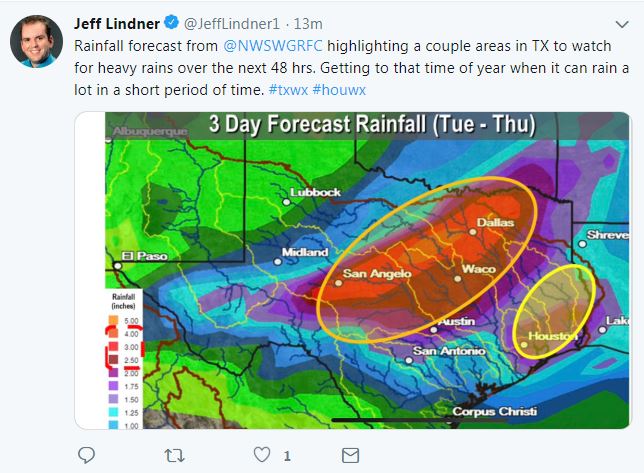 Other threat will be heavy rainfall with a slow moving line of thunderstorms into Wednesday morning. Widespread rainfall amounts of 1-2 inches appear likely with isolated totals of 3-4 inches where any cell training occurs. Grounds are starting to become wet across the region…especially north of I-10 from the recent rainfall and the middle Trinity and Navasota Rivers are in minor flood, so additional widespread rainfall will likely cause additional rises on area rivers.