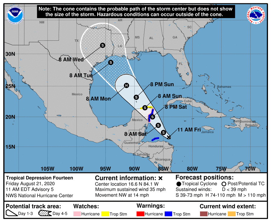 A weaker TD14 now increases the likelihood of a Texas landing.srainhoutx wrote: ↑Fri Aug 21, 2020 7:34 am RECON suggests that TD 14 continues to struggle and remains disorganized. Same goes for TD 13 at this time. Honestly I have little confidence in the various computer schemes this morning. Fact is 14 and 13 are not strengthening as had been expected and that may well have significant impacts on both track and certainly intensity guidance. That said do NOT let your guard down. We'll have the weekend to prepare as if a Hurricane arrives Monday night into Tuesday.