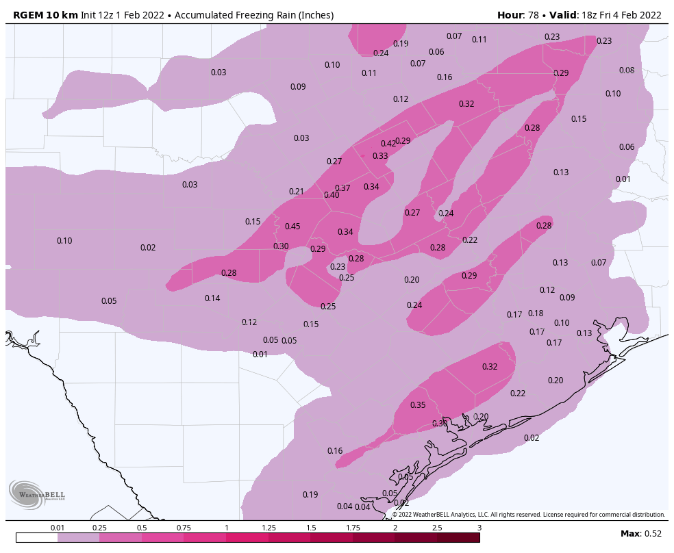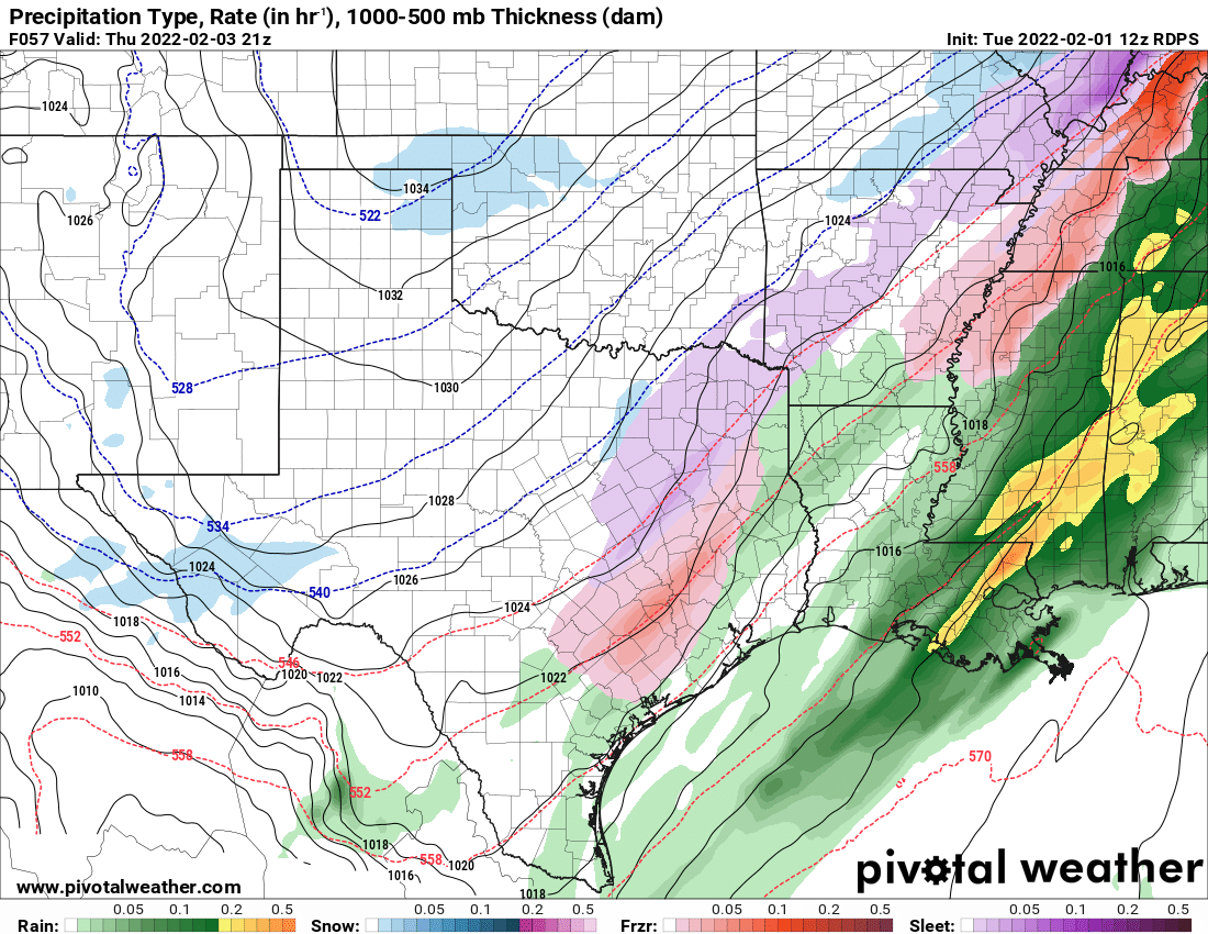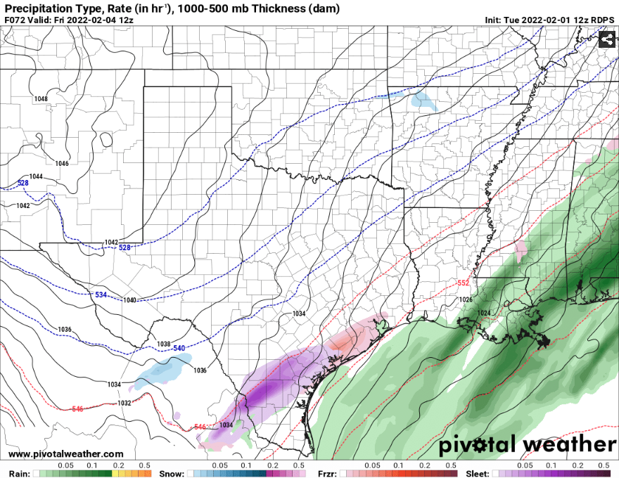 Looks like the freezing mark will likely set up around the College Station region into Bastrop. Along and north of State Highway 21 looks like the best call at this point. It still looks like the warm nose won't get eroded until late in the day so freezing rain/ice pellets look like the most likely p-type once temps drop below freezing. Still likely a pretty decent event for the Hill Country into Northern Texas. Those across North Texas could see upwards of 1/4'' - 1/2'' of ice which would be borderline for significant impacts/power outages. Closer to home we will likely be looking at lows in the upper 20s Friday and possibly Saturday morning. Finally, something to keep an eye on is any residual moisture on Friday or Saturday as the shortwave trough ejects to the east. That could result in an isolated shower but model support still remains marginal at best.