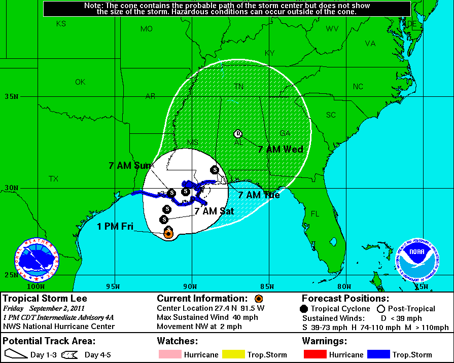 AT 100 PM CDT...1800 UTC...THE CENTER OF TROPICAL STORM LEE WAS
