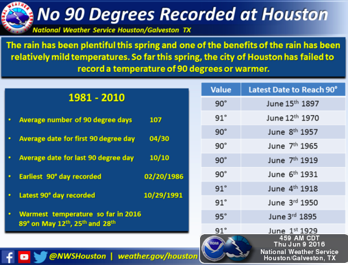 Temperatures remain “cool” for this time of year with IAH stilling not having reached 90 degree this year. Today will likely be the last day we could possibly hit 90, before increased clouds and rain chances keep afternoon highs in the mid or upper 80’s over the weekend. Wet grounds and green vegetation are helping to keep the temperatures cooler than normal.