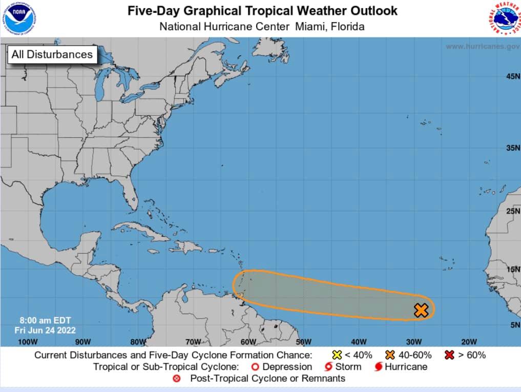 Formation chances for a tropical system up to 60% with current Eastern Atlantic wave heading in the general direction of the eastern Caribbean Sea.