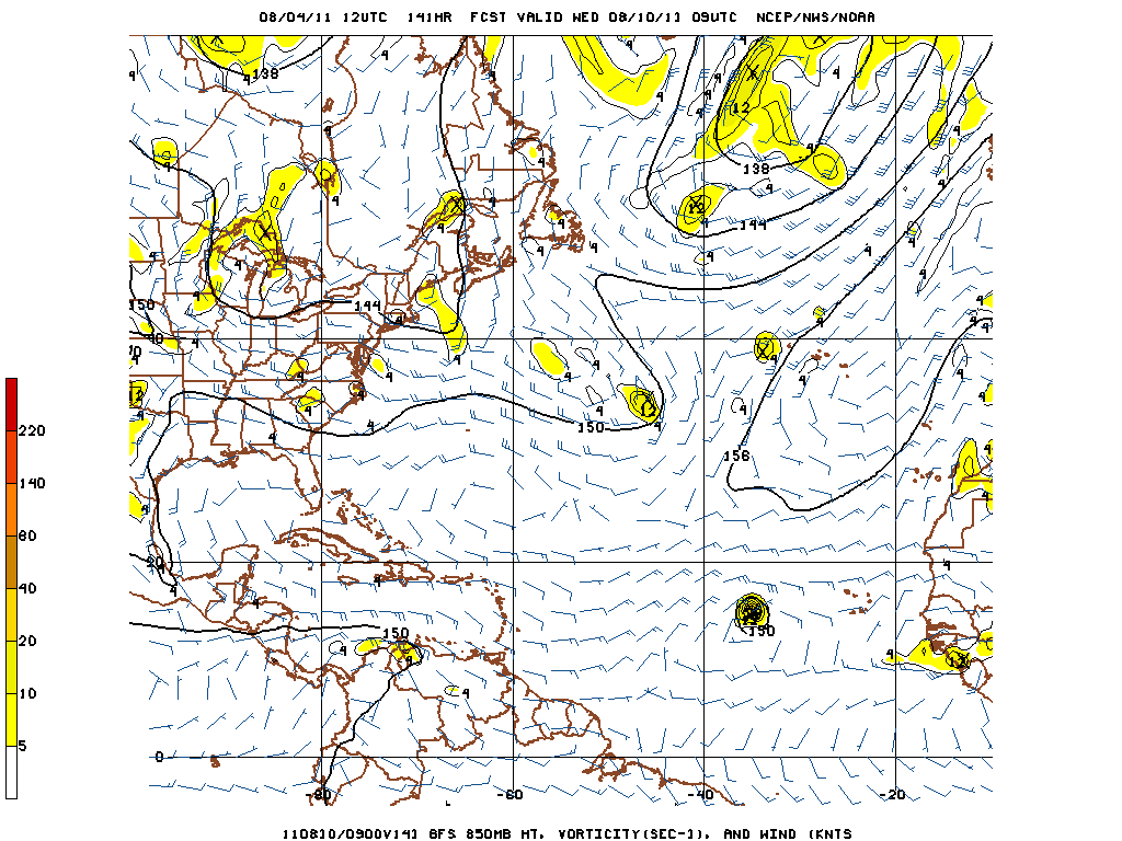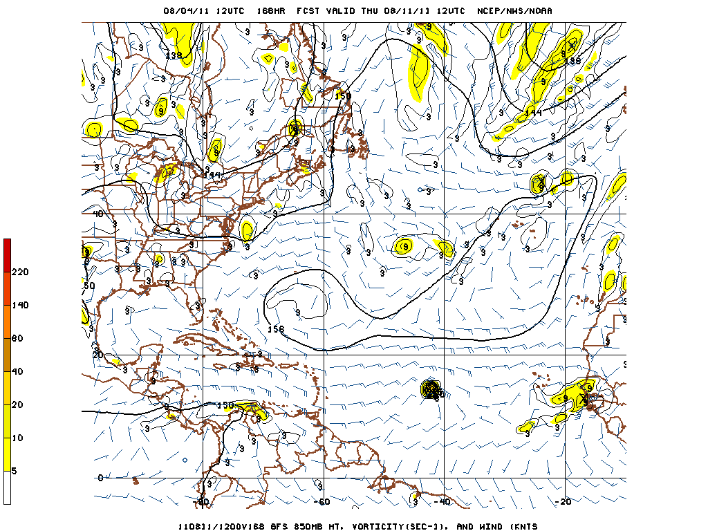 Euro appears to be developing a different system, as the GFS has a storm near the NE Caribbean at 240 hrs but the Euro has it at 45W, 3-4 days behind the GFS's storm. The GFS storm moves off the west coast of Africa Sunday, the Euro's 3-4 days after Sunday. Typical activity, model and otherwise for the second week of August. It's going to heat up soon out there.