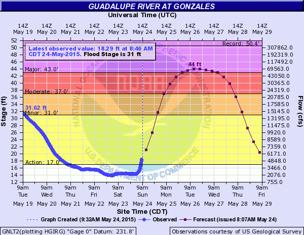 Tremendous flood wave on the Blanco River with empty into the San Marcos River and then the Guadalupe River above Gonzales, TX. Major flooding is forecast along the Guadalupe River from above Gonzales TX to below Victoria, TX this week.
