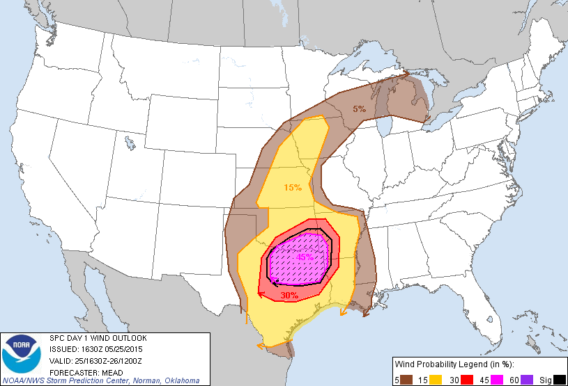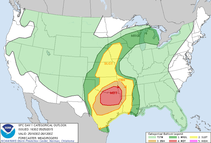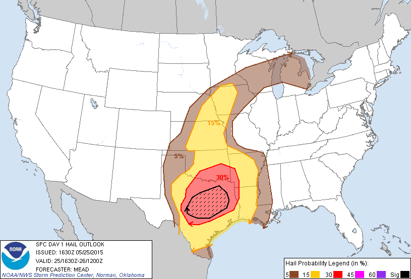 The Storm Predication Center Updated Convective Outlook maintains a Moderate Risk for Severe Storms across portions of N, NE, E Texas and SE Oklahoma. The hail threat has shifted a bit further S into the Hill Country and the primary threats remain large hail and damaging winds and an isolated Tornado or two.