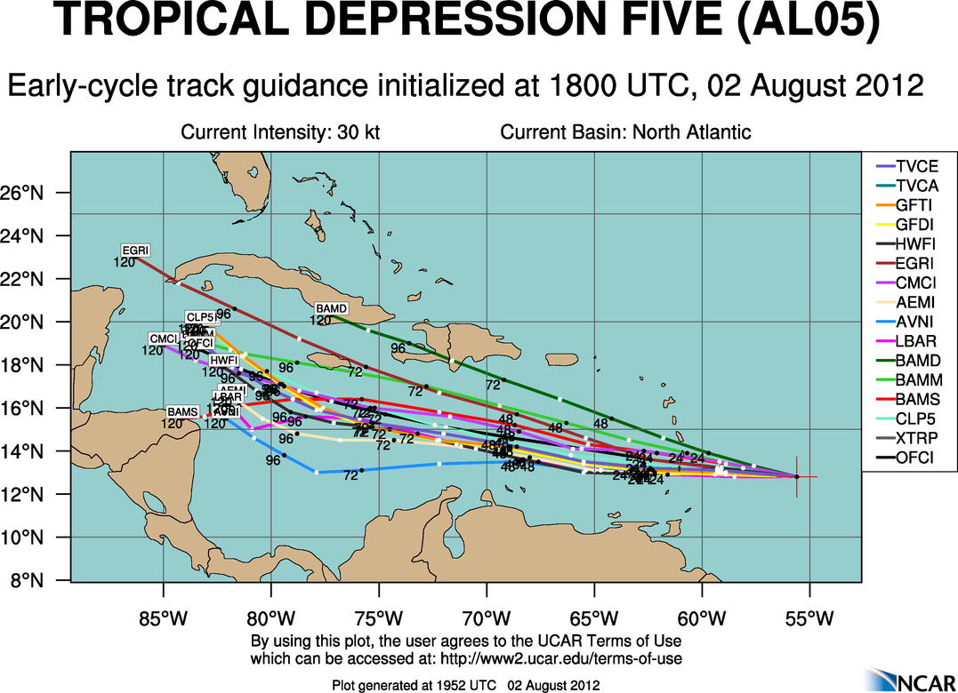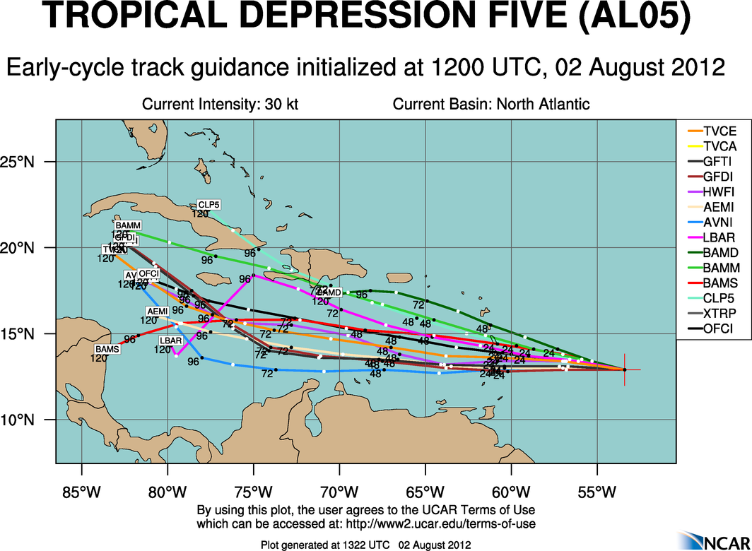 TD 5 is moving W to WNW south of a large deep layer ridge of high pressure over the central Atlantic Ocean. This ridge extends westward toward the SE US coast and TD 5 will track along the south side of this feature for the next several days. It is a fairly straight forward and medium to high confidence forecast track with the system moving through the Windward Islands on Friday and the Caribbean through the weekend into early next week. Once in the western Caribbean Sea, models begin to diverge with respect to the intensity of the high pressure over the US Gulf coast and the weakness that is expected to develop this weekend over the NE Gulf and track westward toward TX. Some of the models show a NW turn developing suggesting the weakness will be pronounced enough to slow and turn the storm, while others maintain a strong ridge and drive the system W to WNW.