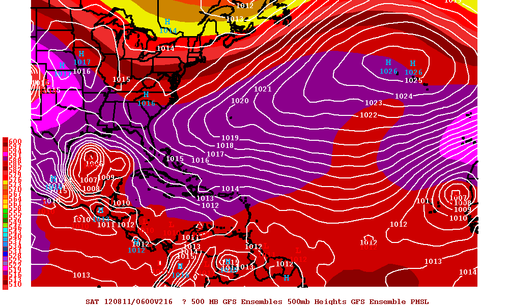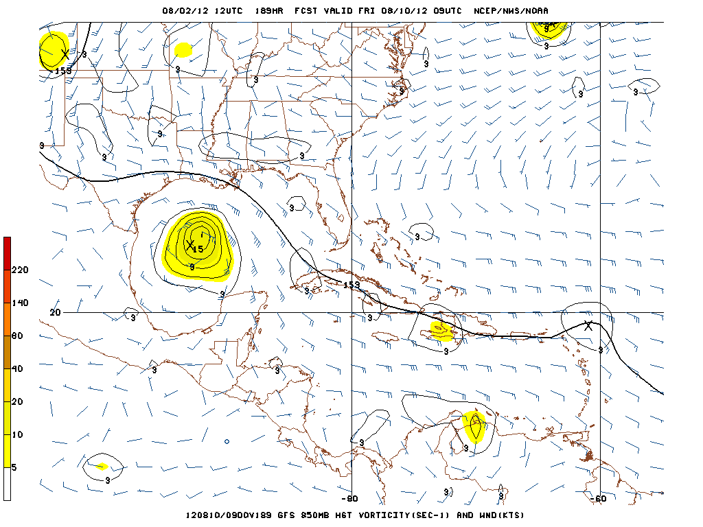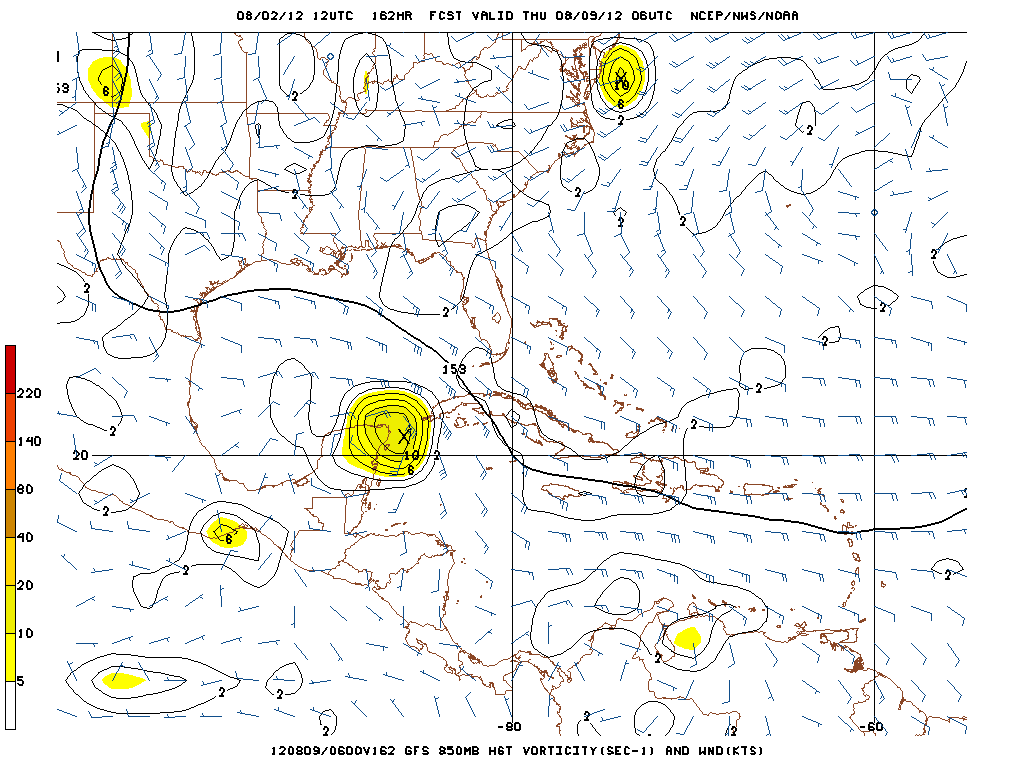 The 12Z Operational GFS continues to advertise a weak system traversing the Caribbean. Once TD 5 approaches the NW Caribbean, conditions improve and the disturbance slows and begins to organize fairly quickly. What is interesting is the GFS is now suggesting a TS passing very close to the Yucatan Channel with little land interaction which becomes rather concerning for the future development of a potential Hurricane Ernesto.