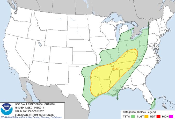 SPC has expanded the slight risk area to include most of SE TX for this afternoon as the air mass warms into the mid to upper 80’s instability will rise into the 2000-2500 J/kg range. Main thrust on ongoing bow echo and corridor of wind damage should be from roughly Lake Livingston to Lake Charles however westward development on a surging outflow boundary to the SSW/SW is expected to affect a good part of the region by midday/early afternoon as suggested by HRRR and TX TECH high resolution models.
