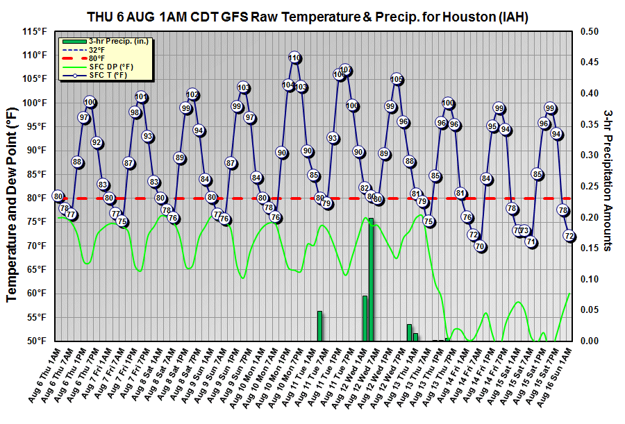 wxman57 wrote:The 12Z GFS still indicates that Monday will be the hottest day of next week, and probably 2015. I think IAH may see 106 on Monday, possibly 107. I DO see a pattern change indicated in the 12Z GFS, though. After NEXT weekend, the ridge backs off to the west as an upper low builds over the mid Gulf coast. The low moves west into Texas by the 18th-20th, bringing increasing onshore flow and a good chance of rain, along with not-so-hot temperatures. In two weeks, the ridge shifts to the East U.S. Coast and we're in deep Gulf flow again. Good for rain, but our hurricane shield will be gone.