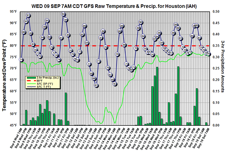 Latest GFS run is a few degrees warmer post-frontal than the overnight run. Nice weather for the weekend but rainy next week. The GFS has also given up on the low in the Gulf, at least as far as it becoming a TD/TS. Frontal wave or weak low most likely.