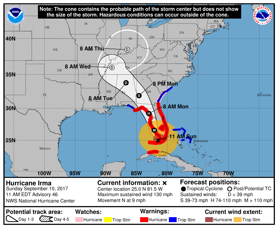 At 800 AM EDT (1200 UTC), the center of Tropical Storm Irma was